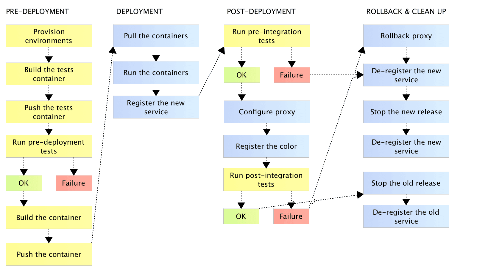 In most instances, the process is far more complex. There are many tasks to run, and each of them might produce a failure. In some cases, a failure should only stop the process. However, more often than not, some additional logic should be executed as part of the after-failure cleanup. For example, what happens if post-deployment tests fail after a new release was deployed to production? We cannot just stop the flow and declare the build a failure. We might need to revert to the previous release, rollback the proxy, de-register the service and so on. I won’t go into many examples of situations that require complex flow with many tasks, conditionals that depend on results, parallel execution and so on. Instead, I’ll share a diagram of one of the flows I worked on.